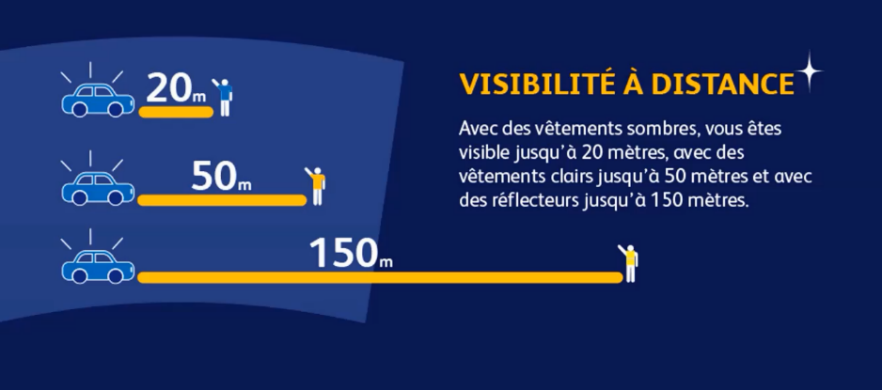 Sachant qu’il faut à une voiture circulant à 50km/h, 27,50 mètres pour s’arrêter par temps sec quand le conducteur a vu l’obstacle : on diminue grandement le risque d’être impliqué dans un accident en tant que piéton en optant pour des vêtements de couleurs ou réfléchissants.